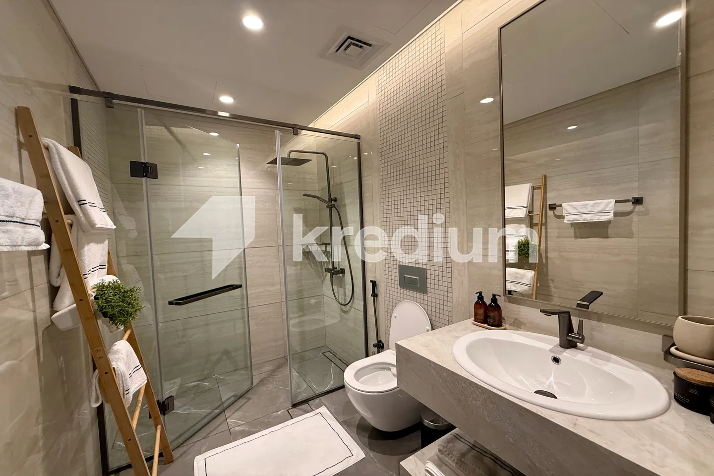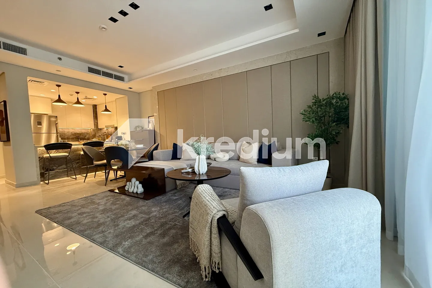 - Home Appliances: Fully equipped modern kitchen with high-end appliances, along with a 65” LED TV in the living area and a washing & drying machine.