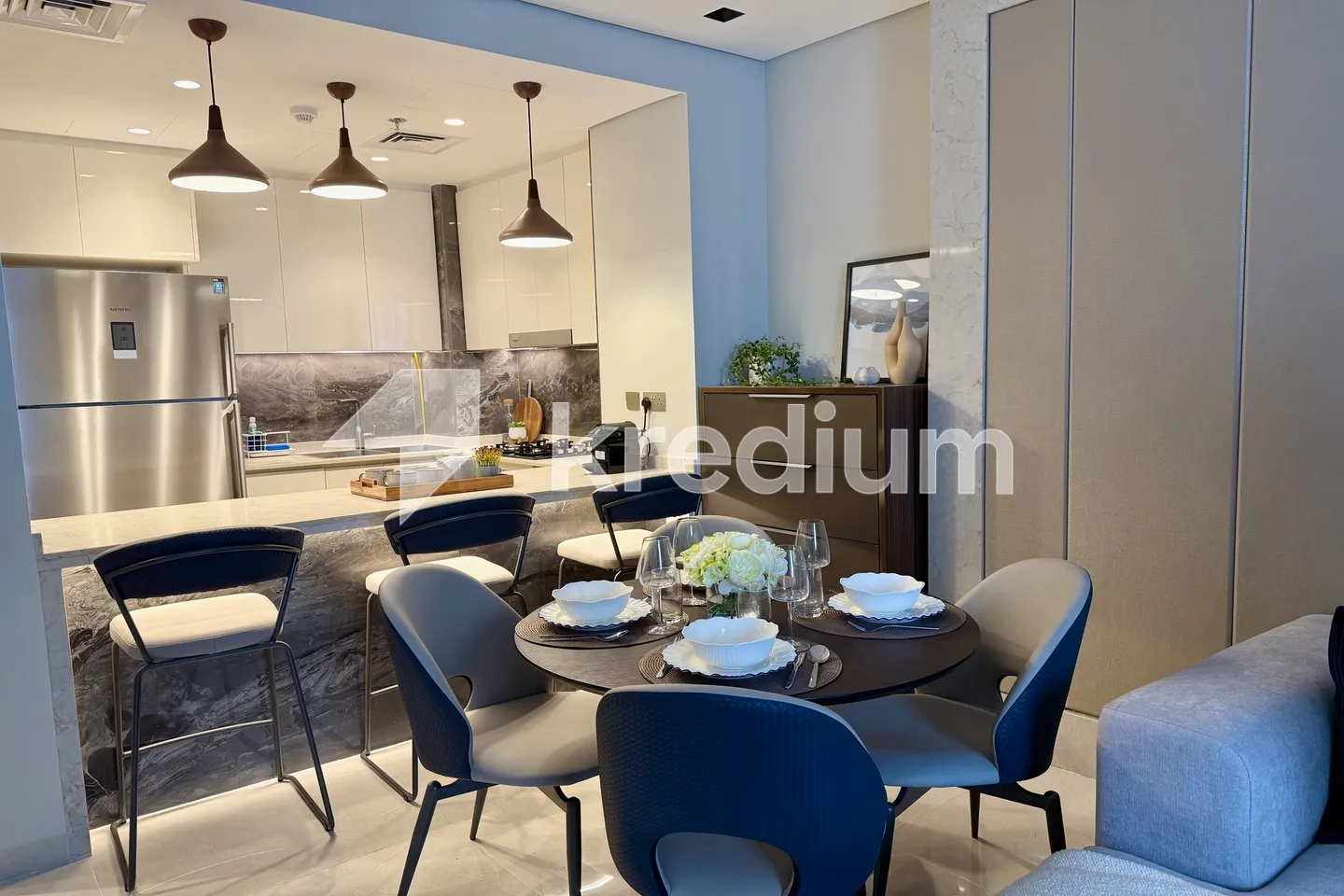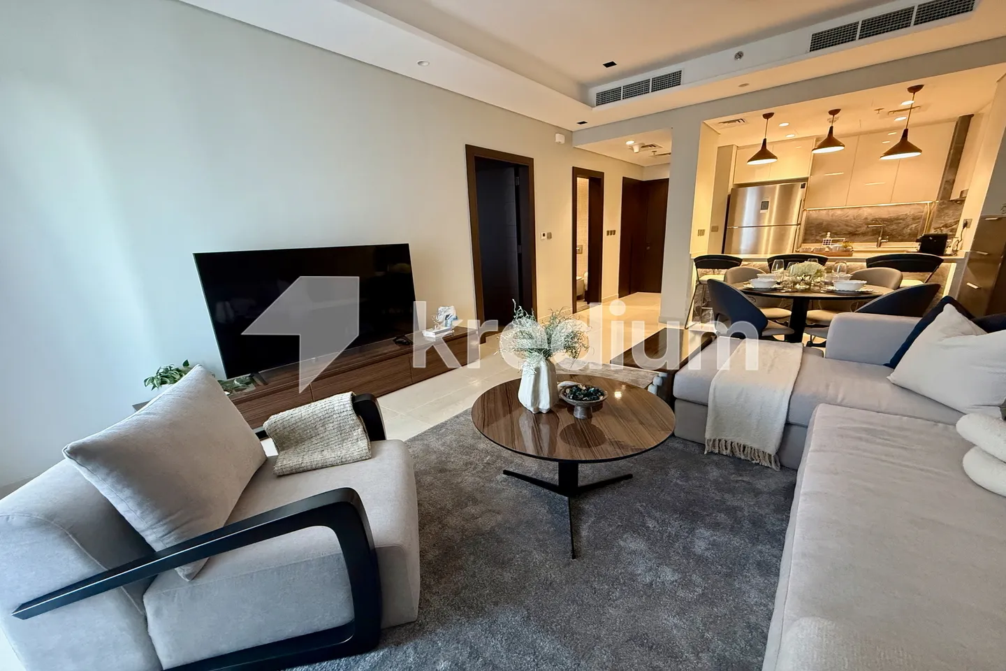 - Home Appliances: Fully equipped modern kitchen with high-end appliances, along with a 65” LED TV in the living area and a washing & drying machine.